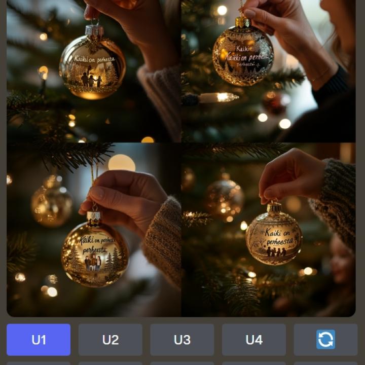 Midjourney loi neljä erilaista kuvaa. Näistä valokoitui jatkoon ensimmäinen kuva, jossa joulukuusenkoristeen heijastus perheestä oli onnistunein. Kuten kuvista huomaa, koristepalloihin luodut tekstit ovat vääristyneet.