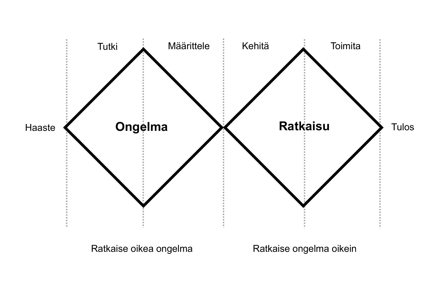 Tässä osassa tarkastelemme miten palvelumuotoilijat käyttävät tekoälyä tuplatimantin eri vaiheissa. British Design Councilin 2005 kehittämä tuplatimantti (The Double Diamond) on palvelumuotoilun tunnetuin prosessimalli. Prosessimallissa on nimensä mukaisesti kaksi timanttia. Ensimmäisen timantin vaiheissa pyritään tutkimaan, määrittämään ja ymmärtämään kehitystä vaativa oikea ongelma ja toisen timantin vaiheissa keskitytään etsimään oikea ratkaisu ensimmäisessä vaiheessa löydettyyn ongelmaan.