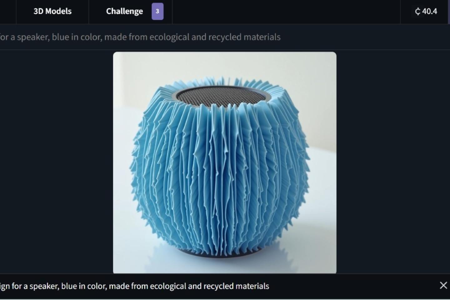 Kokeillaan generoida kuvia esimerkin kaiuttimesta. Kuvageneraattorina tässä esimerkissä toimii CGDream, jonka ilmaisessa versiossa on päivittäin käytössä 100 credittiä. Jokaiseen kuvaan menee vähintään 20 credittiä, riippuen filtterien käytöstä ja kuinka monta variaatiota haluaa. Kyseisessä generaattorissa filttereitä voi käyttää auttamaan kuvan generoinnissa. Filtteri vaihtoehtoja on monia, ja tekoäly antaa ehdotuksia jo promptin kirjoittamisen aikana. Annan tekoälylle promptin “a new innovative design for a speaker, blue in color, made from ecological and recycled materials”, joka näkyy ruudun ala- sekä yläkulmassa.