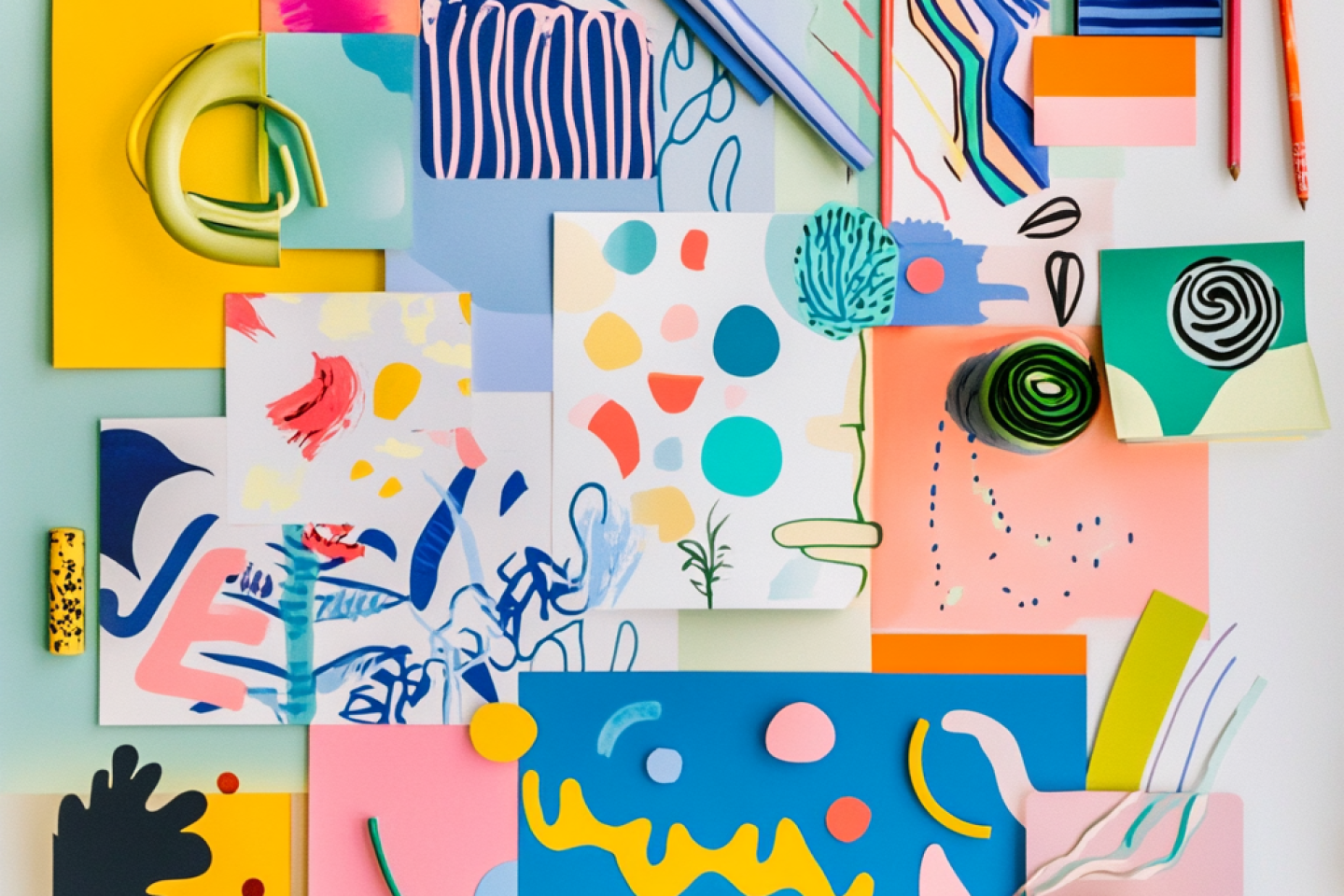 A moodboard for creative branding project, vibrant and playful color palette, quirky hand-drawn illurtations, mix of pastel and bright colors, bold typography, and abstract shapes that convey energy and fun.