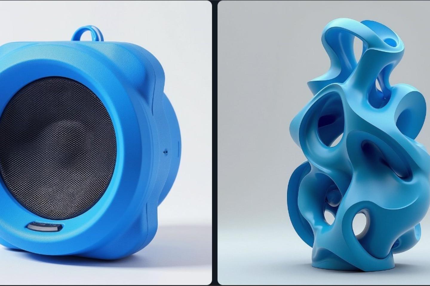 Kaksi eri variaatiota alkoi tuottamaan enemmän tulosta. Oikean puolen kaiutin on hyvin abstrakti, muttei välttämättä hyvin toteutettavissa. Vasen kuva vaikuttaa sen sijaan paljon lupaavammalta. Ulkonäöltään kaiutin ei kuitenkaan vaikuta olevan tehty kierrätysmateriaaleista, joten kokeillaan vielä generoida kaksi kuvaa lisää muuttamalla promptia. Käytetään edellistä promptia pohjana, mutta otetaan siitä pois “innovatiivinen” ja “sininen”, joten uusi prompti olisi “a new design design for a speaker that is made from ecological and recycled materials”. CGDream päätyi siten näihin tuloksiin: