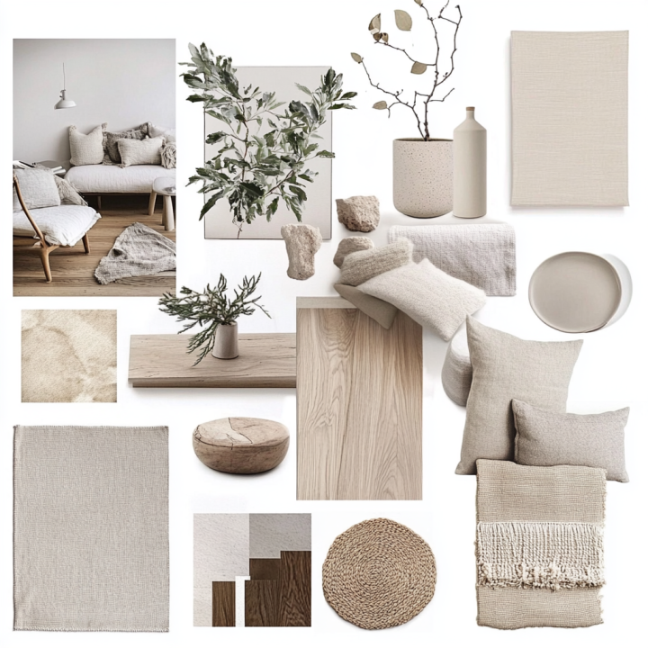 A moodboard for Scandinavian interior design, with light wood textures, neutral color palette of white, grey, and beige, cozy and minimalist style, natural light, warm textiles, and house plants.
