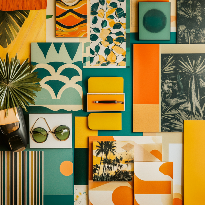 A moodboard for retro graphic design, featuring bold colors like orange, teal, and mustard yellow, vintage patterns, old-school typography, 70s-inspired shapes, and textures of old papre and vinyl.