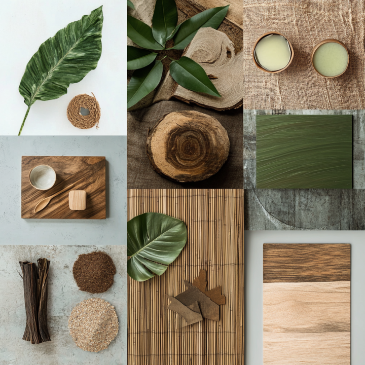 A moodboarb for eco-friendly product design, featuring natural materials like bamboo and recycled plastic, earthy color palette of greens and browns, textures of wood grain and leaf patterns, minimalist and sustainable design elements.