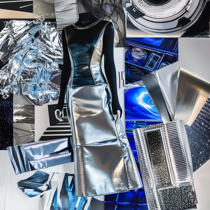 A moodboard for futuristic fashion design, with sleek metallic textures, a color palette of silver, black, and electric blue, inspired by cyberpunk aesthetics, featuring geometric patterns, LED accents, and sustainable materials.