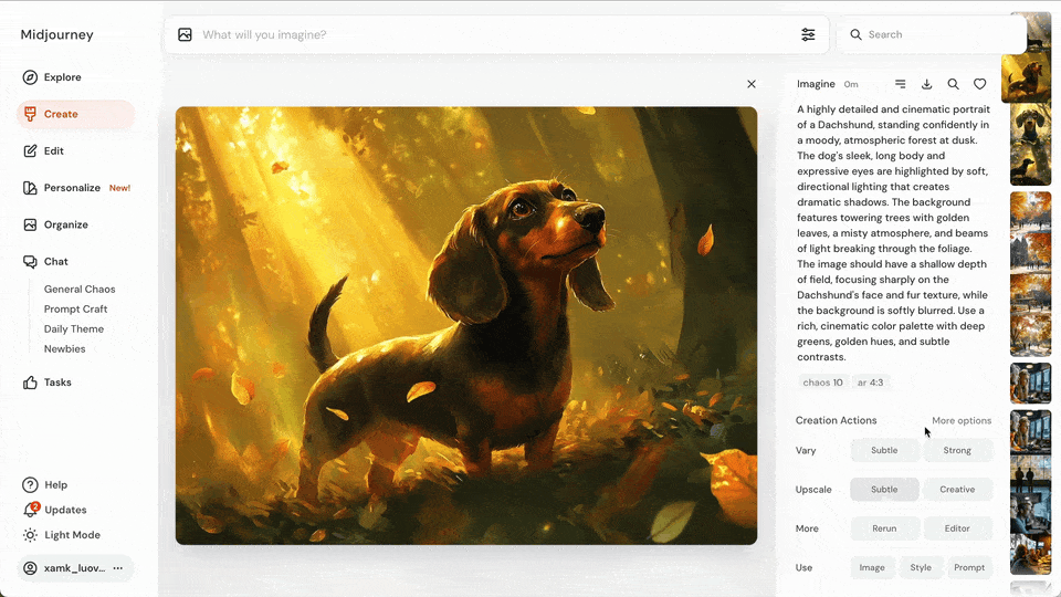 Midjourneyn moottorin uusin versio on tammikuussa 2024 v6.1. Voit valita pudotusvalikosta uusimman tai vanhempia versioita. Uudemmat versiot pyrkivät tekemään entistä laadukkaampia kuvia mm. fotorealistisuus ja promptin parempi toteuttaminen halutunlaisena kasvaa paremmaksi jokaisessa versiossa.